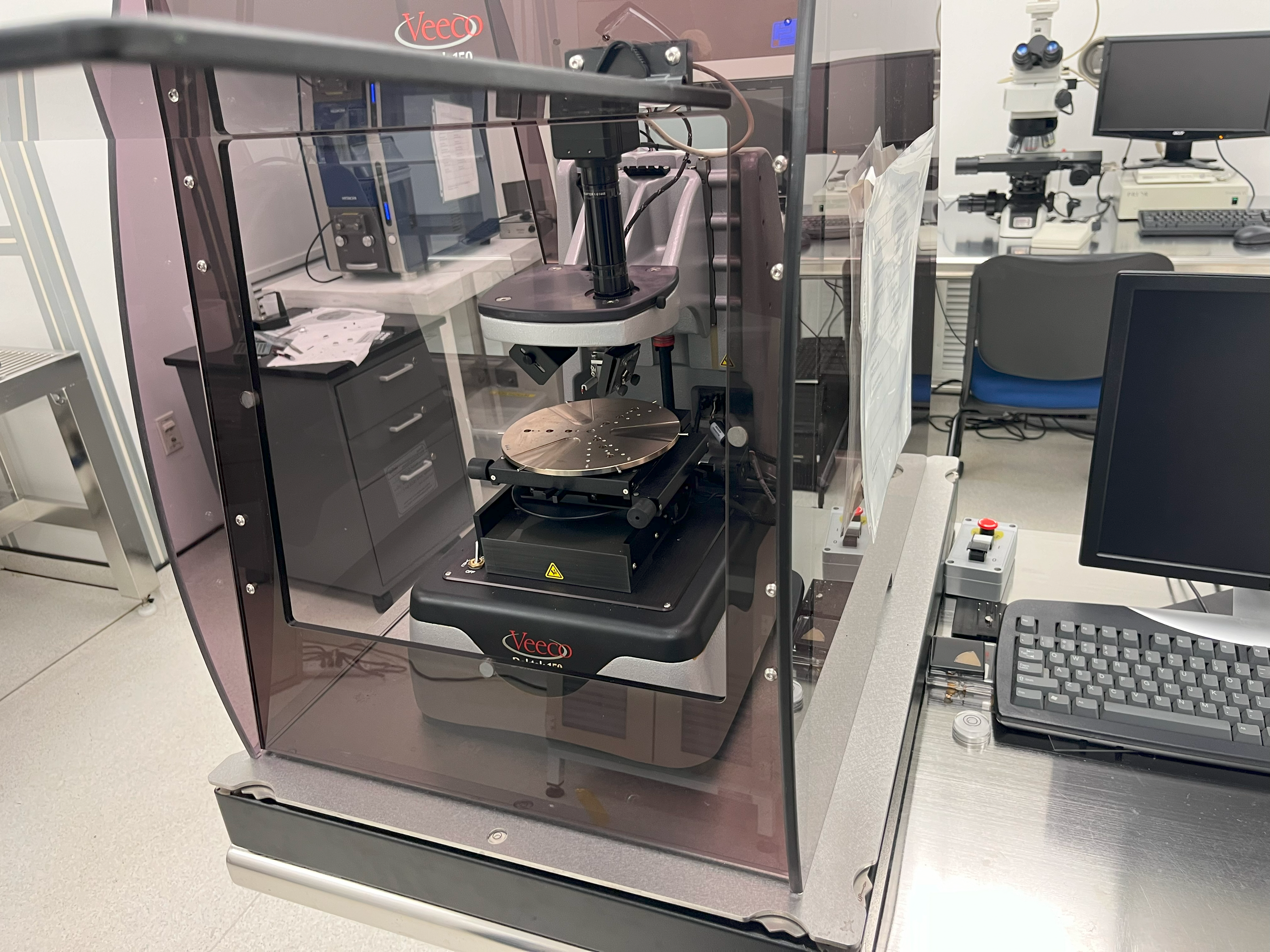 I regularly use optical microscopes for investigating photolithography patterns and surface quality, however sometimes optical measurements are not sufficient for my work. To determine the surface profile of of the wafer, I typically use the Dektak 150 Profilometer for these measurements, which uses a microscopic probe to measure the elevation of the wafer surface.