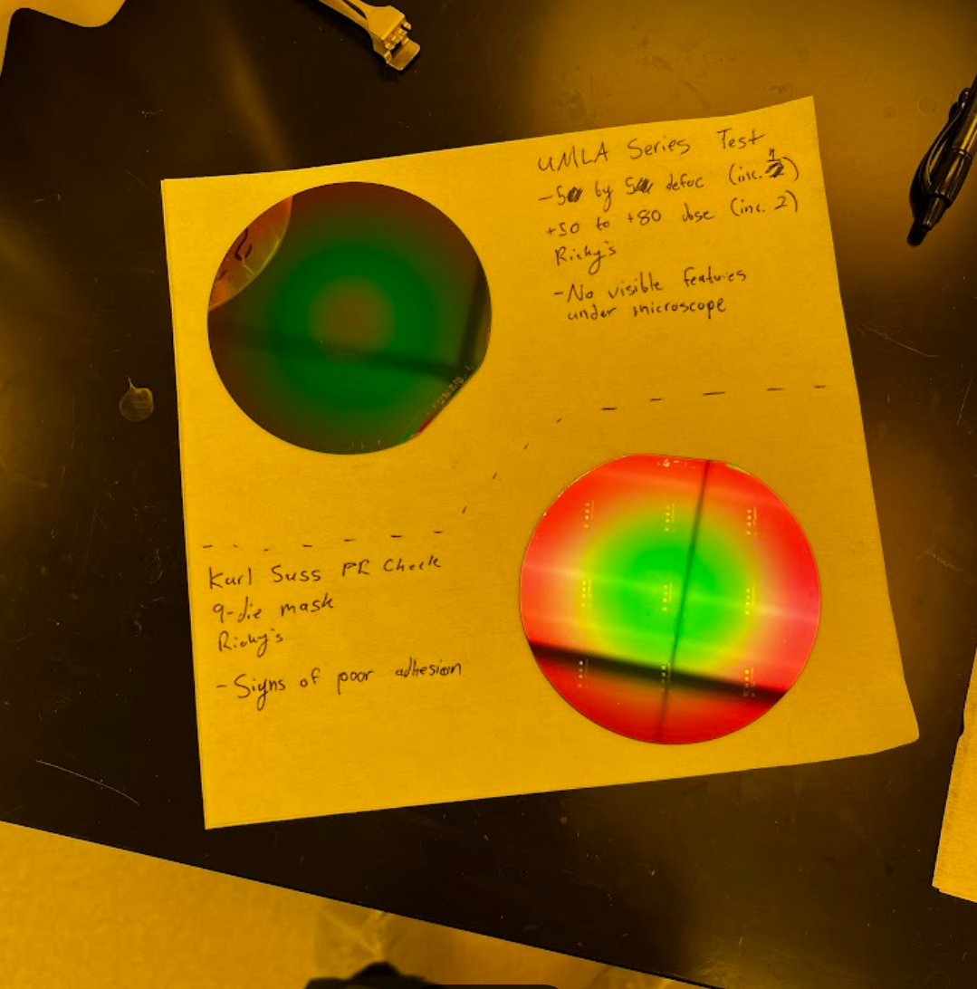 We create these wafers often to test the function of our equipment as well as to provide training on this process to new users. As such, I am well-experienced in photolithography, and I feel confident using these tools in my own research.