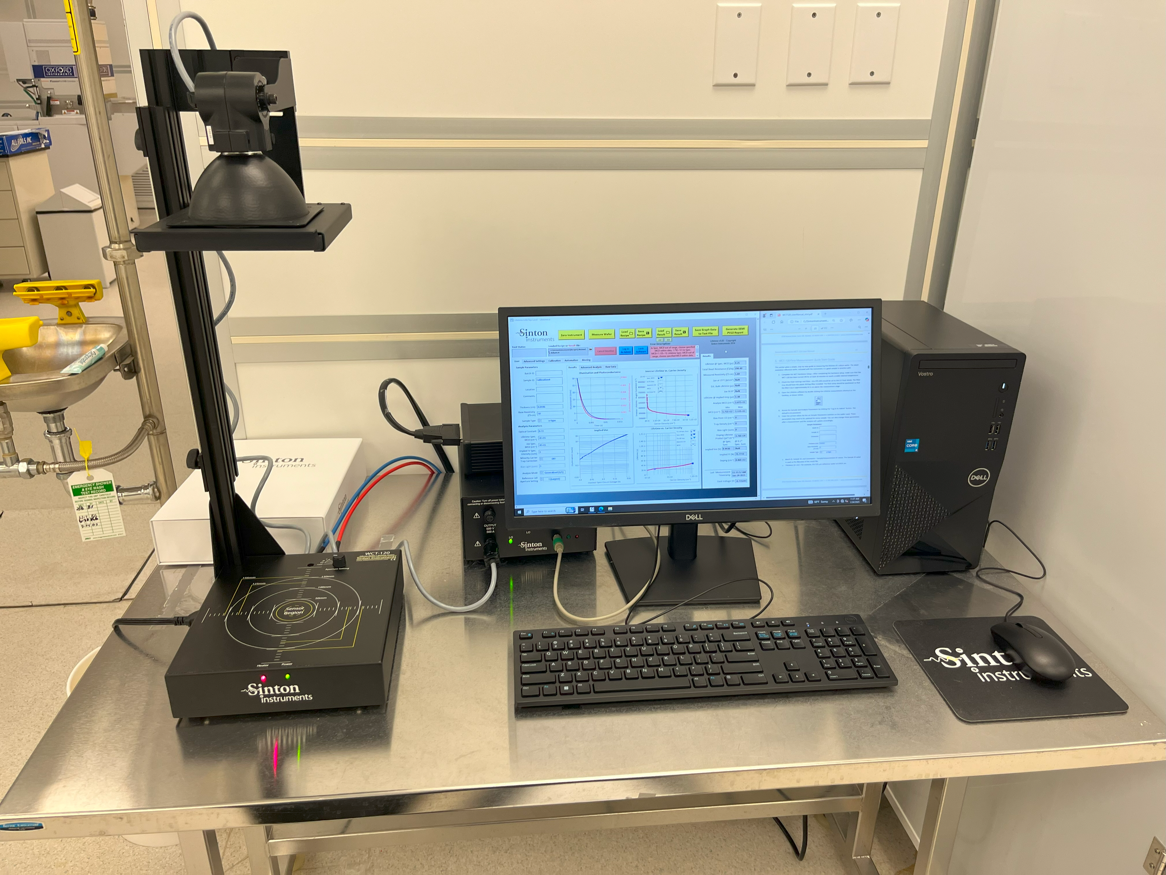 A major portion of my research involves developing new passivation recipes for protecting the device surface, as well as to ensure there is minimal leakage current or noise. This involves both deposition of these films through PECVD and Plasma-Enhanced Atomic Layer Deposition as well as characterization of their performance. At my lab, however, we did not possess a tool capable of performing the photoconductance decay measurements we required for investigating the passivation efficacy. Through connections I made through my research, I was able to secure $26,000 in funding for the lab to purchase a Sinton WCT-120 Lifetime Tester, which has proved vital to my ongoing research. I led the purchasing of the tool, including communicating with the tool vendor and submitting Sole Source documentation for procurement, and I was also responsible for assembling the tool. I created a workstation for the tool to be used and set up the supporting equipment, then I spent time learning how to use the tool. I confirmed the validity of the tool using a variety of reference wafers included with the shipment, and eventually the tool was released to our general users.