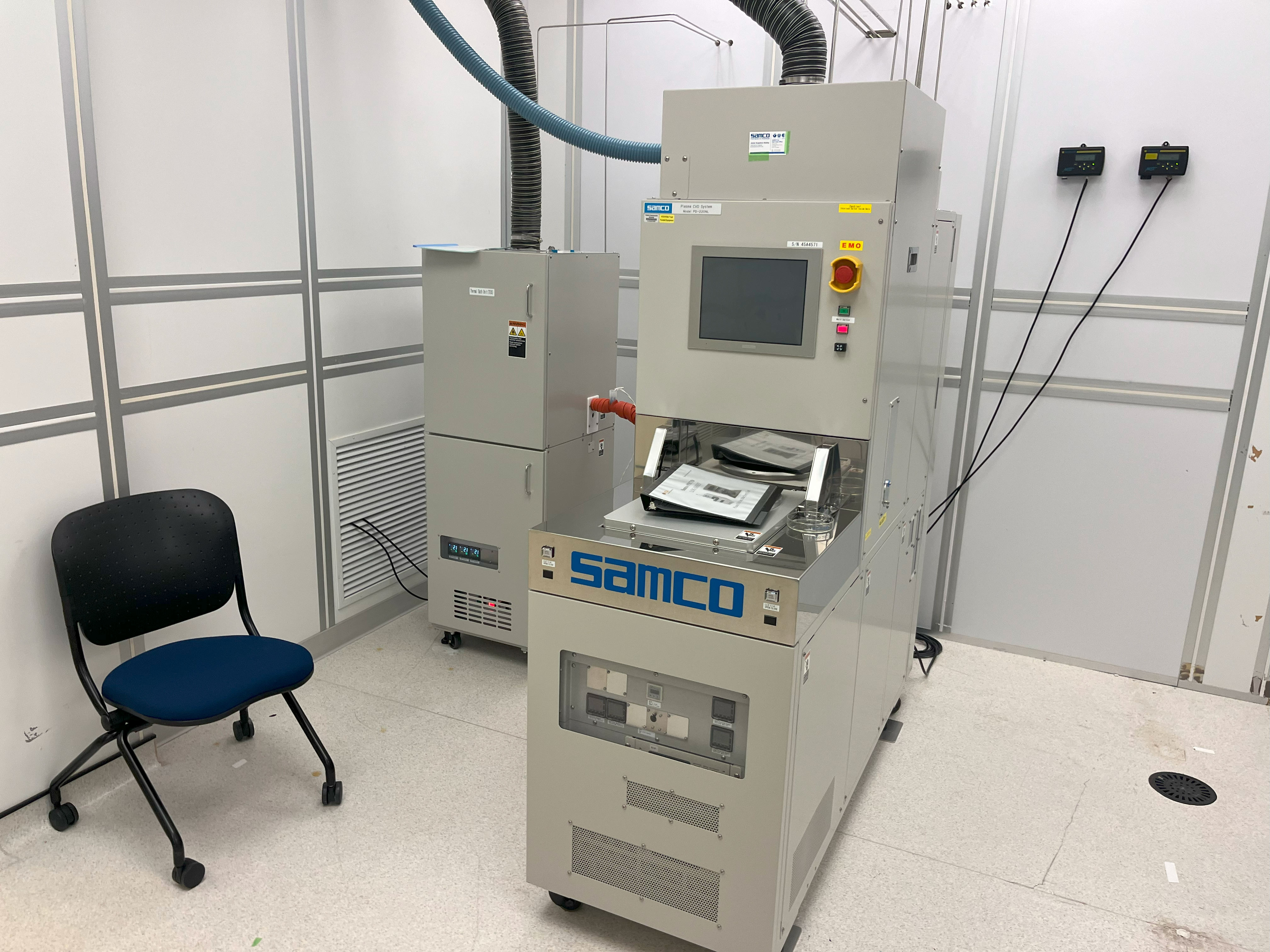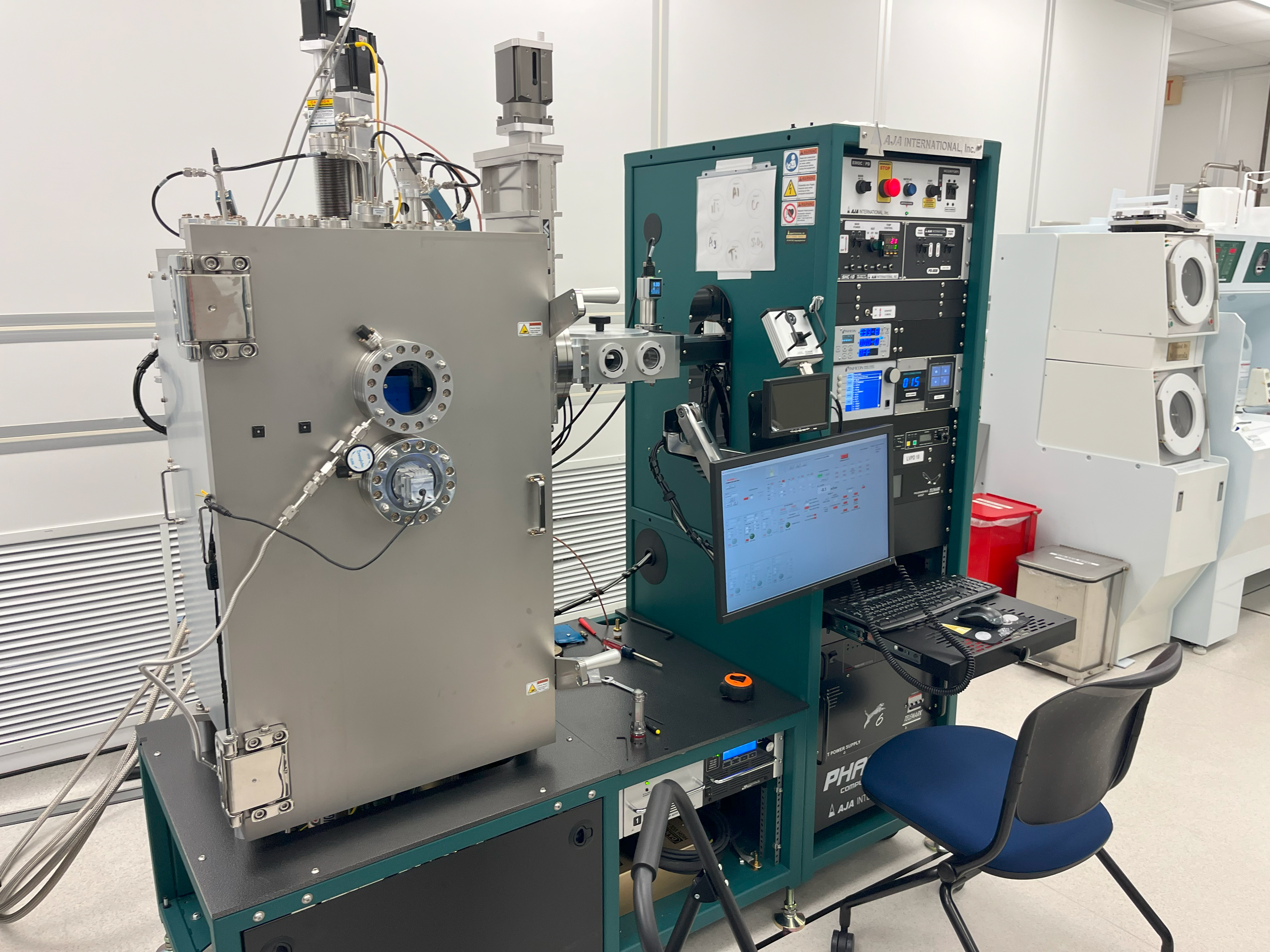 We use a variety of techniques for depositing thin films and metal onto wafers. One such piece of equipment is the Samco PECVD (left), which the installation project for is ongoing. I have been trained as an operator on this tool however it has not yet been released to general users. This tool is used for rapidly depositing large amounts of material and I am actively using this tool in my research investigating passivation AJA Electron-Beam (right), which is used for vaporizing material and evaporating it onto the wafer surface. This creates a highly controllable and cohesive layer of material on the target, and it's preferable for metallization. I was trained on this tool and I've been heavily involved in repairing the cryo-valve, holder assembly, and pneumatic solenoids which form the tool.