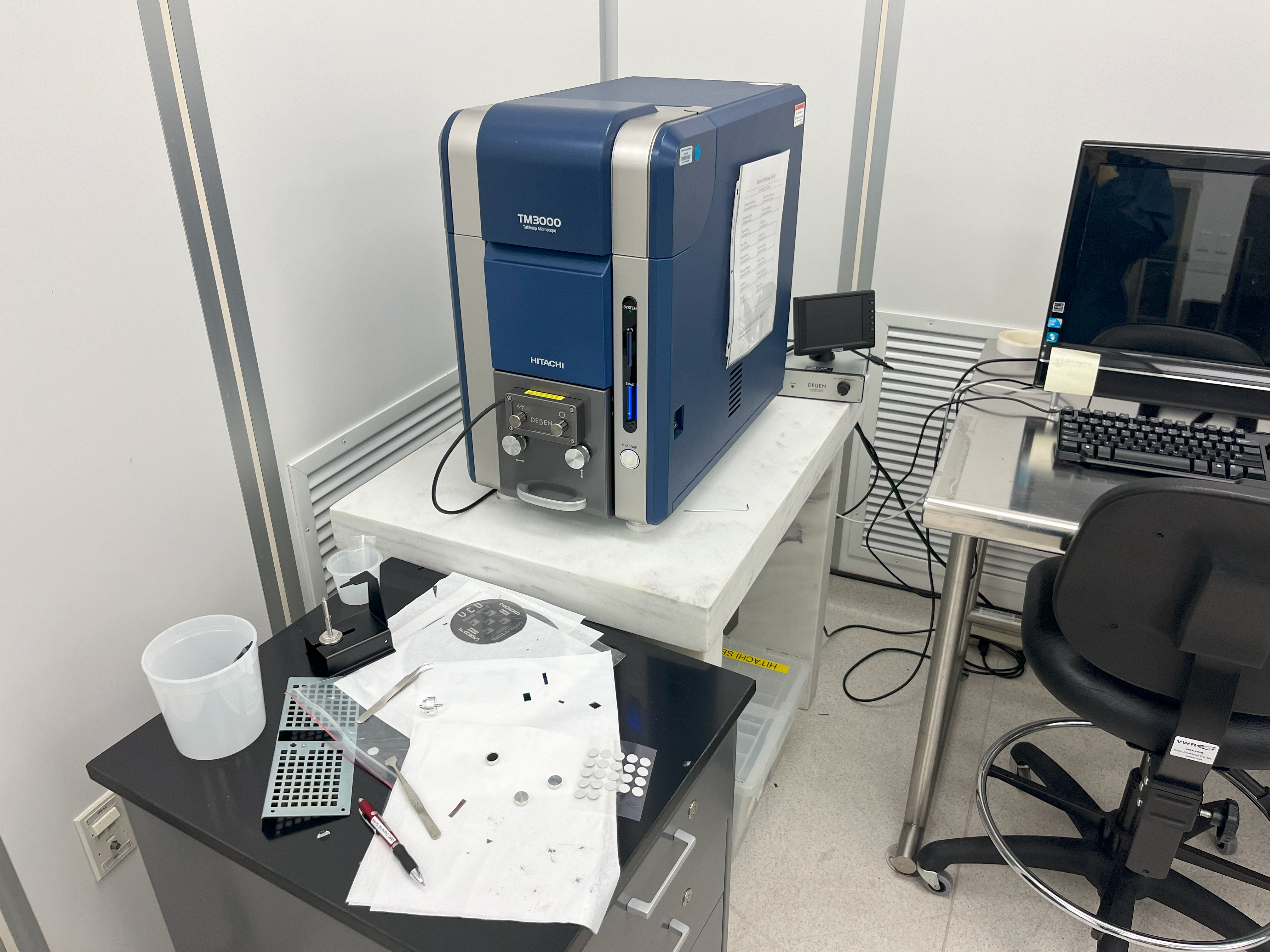 For even smaller features or to image the cross-section of the wafer, I use the Hitachi TM3000 SEM. This tool is a scanning-electron-microscope designed for tabletop use, and is extremely effective in imaging features down to the nanometer scale. I have trained a number of users on the SEM specifically, as it is a popular tool within our cleanroom for analysis.