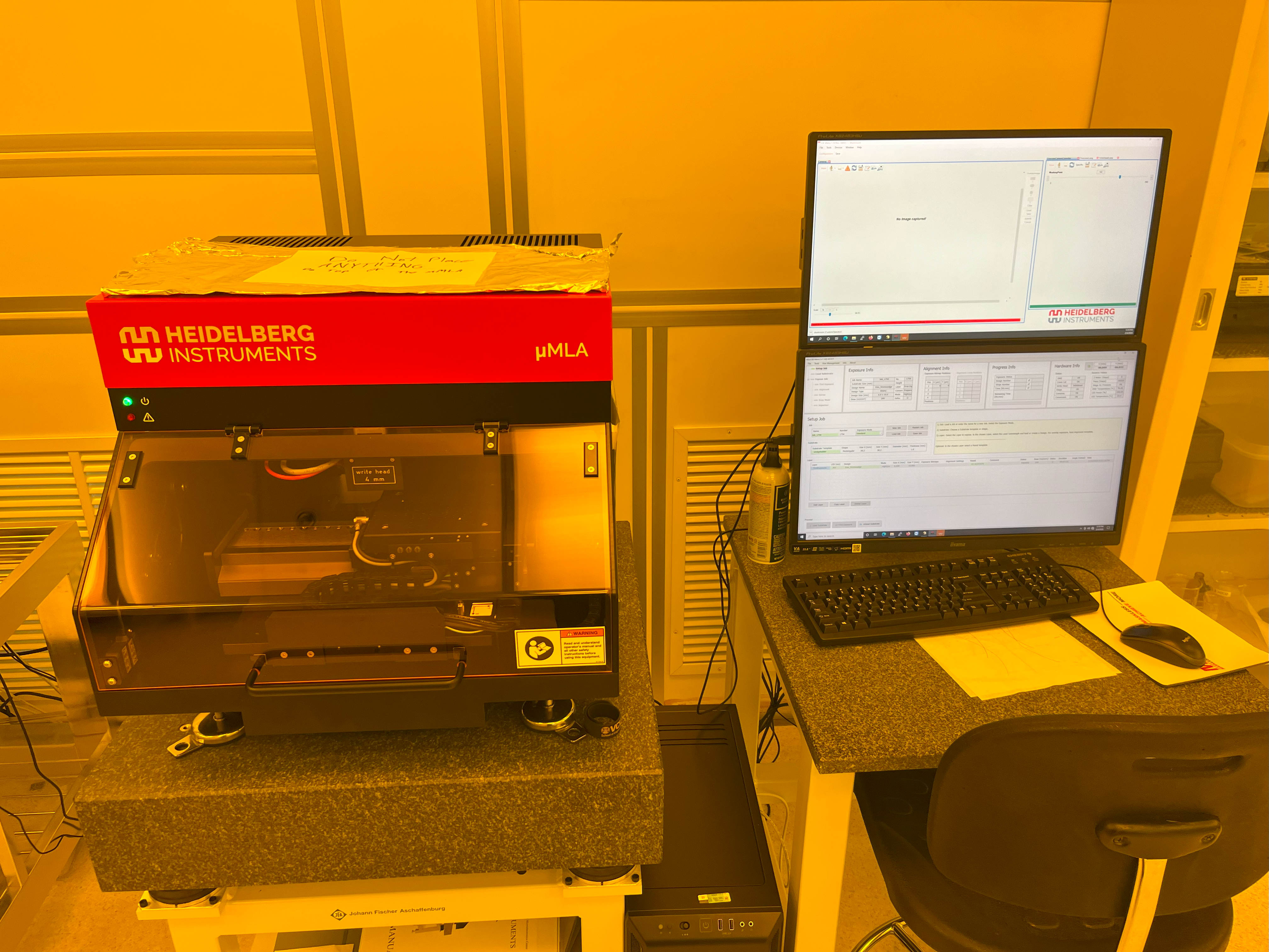 The other tool I have used is the µMLA Maskless Aligner, which uses a piezo-driven laser to write individual lines onto the wafer. These lines can be as small as 500-nm and retain their resolution, which makes it an especially effective option for specialized devices, while the Karl Suss is used for repeatable designs. I am trained in the fabrication of both patterned masks for use on the Karl Suss, as well as creating design files for the µMLA.