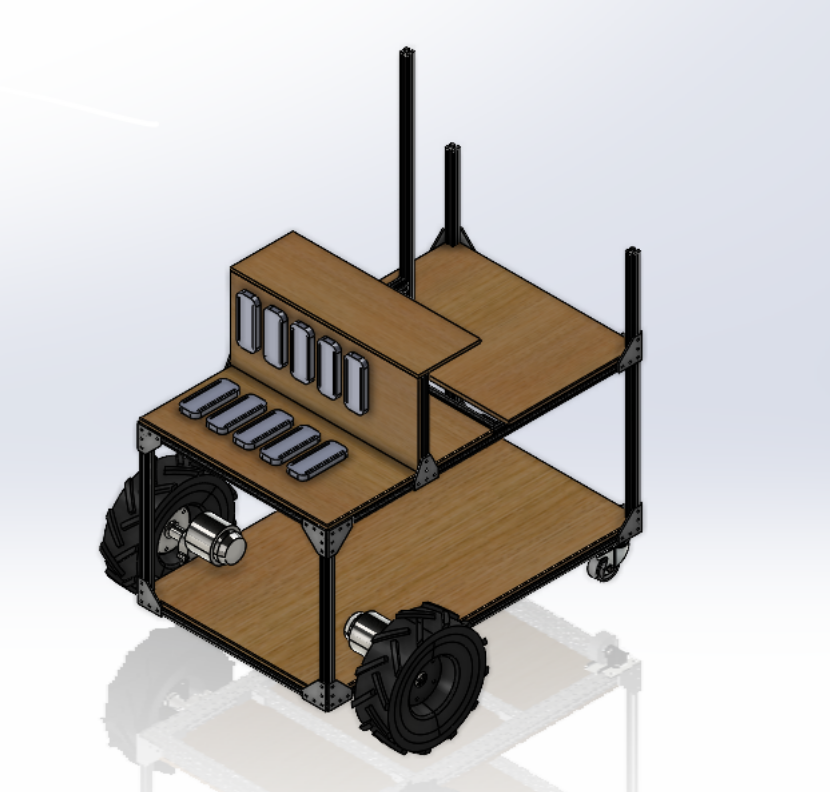 My first major contribution to the project came when we designed the chassis for the vehicle, which was named IMPRIMUS early-on, meaning "the first of its kind". I designed the entire exterior vehicle using SolidWorks, utilizing aluminum extrusion for the structural elements and machined wooden panels to protect the internal electronics. This design was also chosen specifically to fit within the design footprint for the competition and ensure a stable center-of-mass for the vehicle so that it would not overturn.