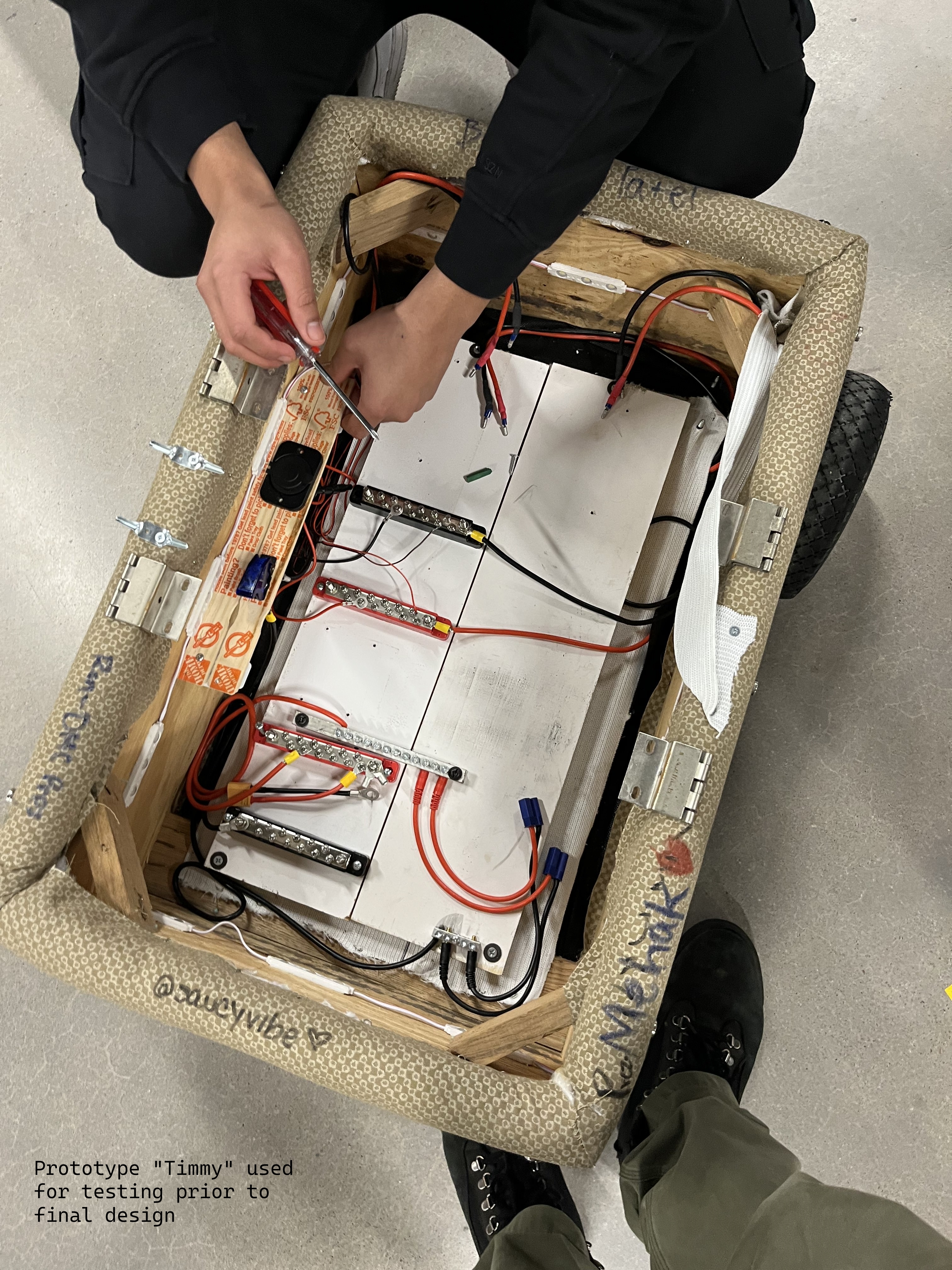 These panels were meant to protect the internals of the machine while being easily removable, allowing us to work on the internals of the vehicle without issue. We also tested the weight of our components, including the power supply and on-board computer, to ensure the vehicle would be stable with this added weight.