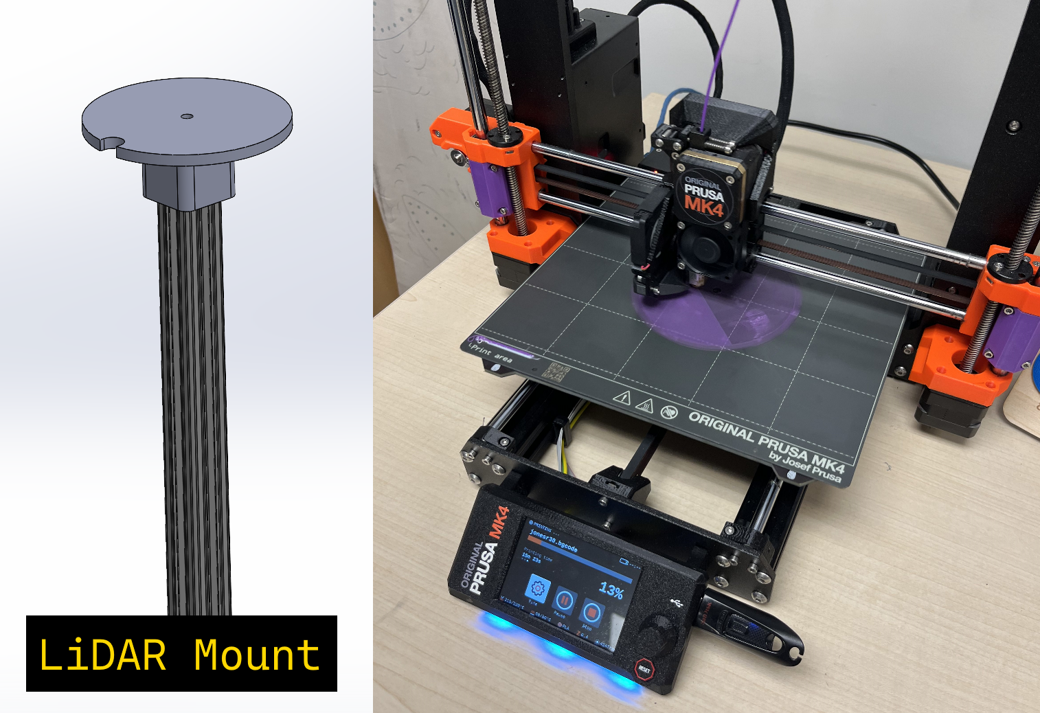 While our team was busy putting together the robot, the Sensor and Computing teams were implementing our design into their autonomous simulation software. We also worked with the Power Systems subteam to connect the power supply and UPS. Our team designed a motor mount for a wheelchair motor, then 3D printed a prototype to ensure our dimensions were correct. Following this, we submitted a work-order to our Makerspace to have the mount machined from aluminum, providing structural stability and reliability for such a heavy component. Finally, after including the wheels and implementing remote control, we had a working vehicle that we could then convert to autonomous.